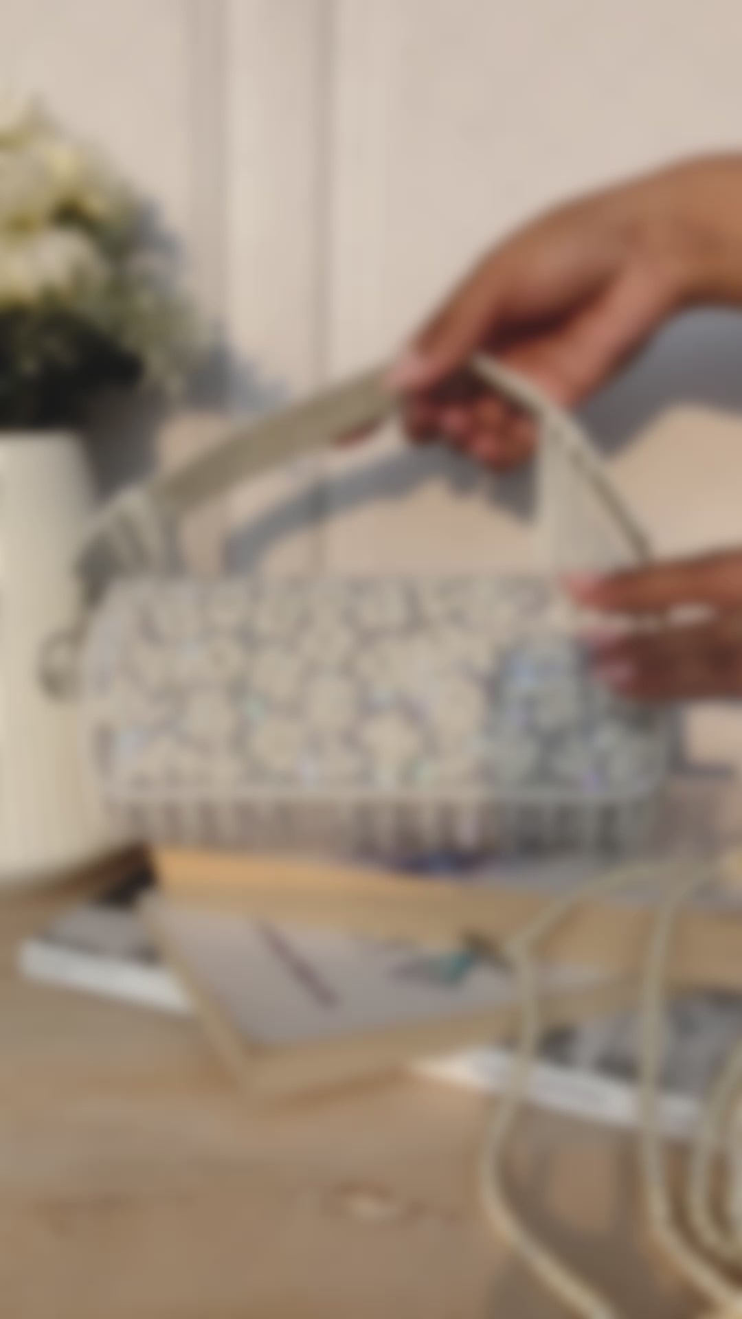 Elegance meets craftsmanship in this stunning cylindrical bag, intricately embellished with delicate pearls. The design is complemented by a pearl handle, allowing you to carry it gracefully by your wrist. Perfect for weddings and festive occasions, this bag adds a touch of timeless sophistication to any outfit.
