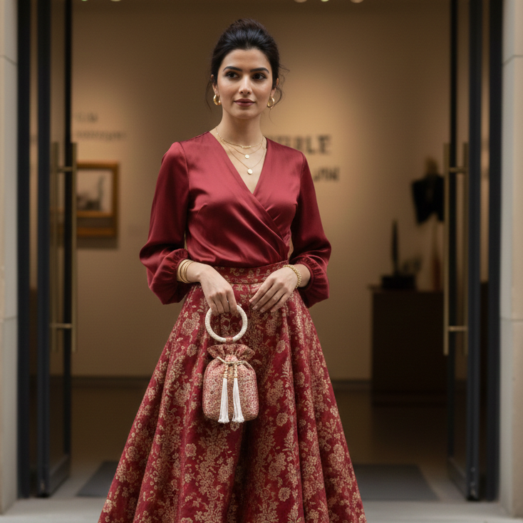 As you pull the drawstring closure tight, the premium silk feels like a whisper of luxury in your hand, offering a sensory delight that reflects your sophisticated taste. Carrying this potli doesn't just hold your essentials—it holds your poise, leaving you feeling radiant, organized, and deeply connected to the beauty of tradition. It is a boost of "big-day" magic that ensures you feel as beautiful and graceful as the celebration itself.
