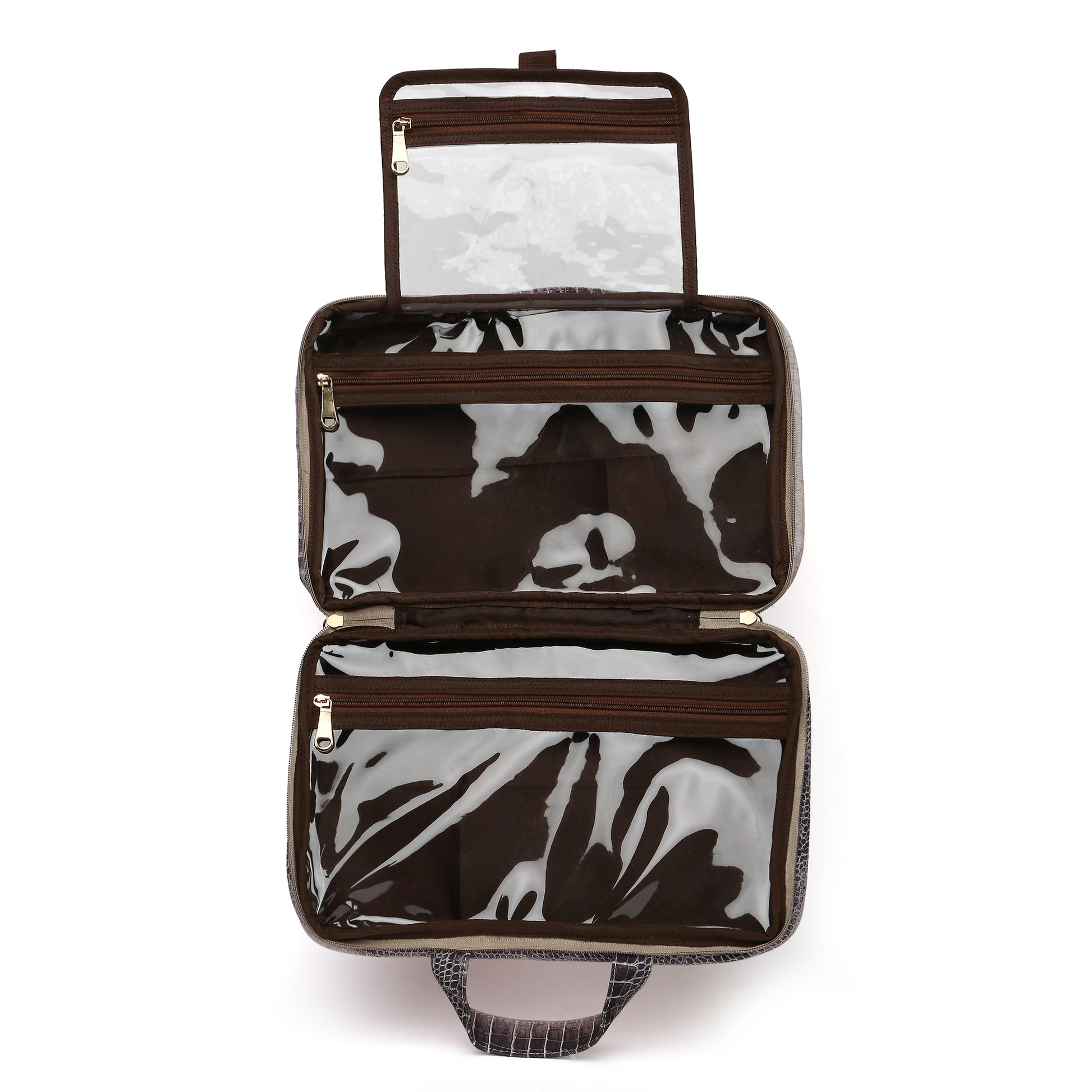 A high-fashion travel sanctuary crafted in bold Black Croc-print Jacquard, designed to keep your beauty world organized with sharp, sophisticated edge.