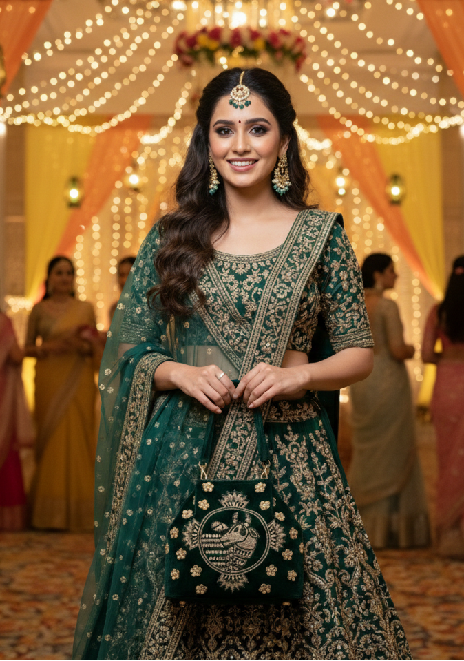 As you carry this symbolic treasure, the hand-embroidered cow motif—traditionally depicted facing the divine—serves as a grounding reminder of peace and devotion. Carrying this handbag doesn’t just complete your wedding or gala attire; it empowers you with the grace of centuries-old Pichwai art, leaving you feeling like a custodian of heritage who radiates both artisanal luxury and a sacred, sophisticated charm.