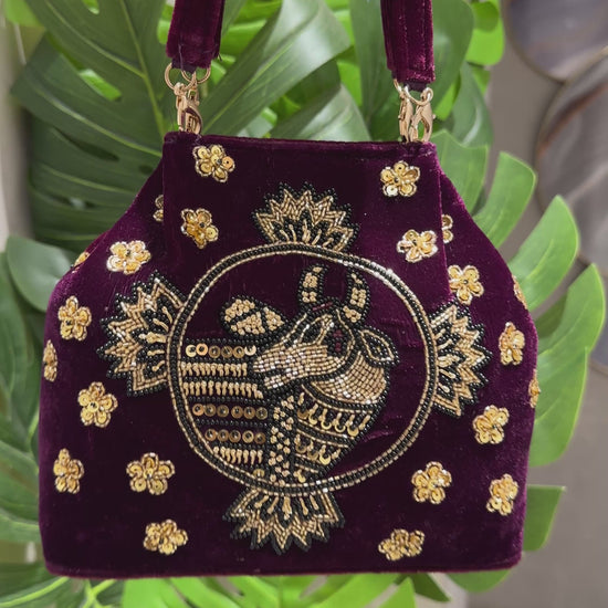 The Maroon Velvet Cow Pichwai Handbag is a regal and heritage-inspired accessory, beautifully adorned with intricate gold zardosi and shimmering sequin embroidery. Its rich maroon velvet base showcases a majestic cow motif, capturing the timeless elegance of traditional Indian craftsmanship in a sophisticated, modern silhouette. Perfect for weddings and festive galas, this handcrafted handbag offers a touch of artisanal luxury, making it a must-have statement piece for any celebratory ensemble.