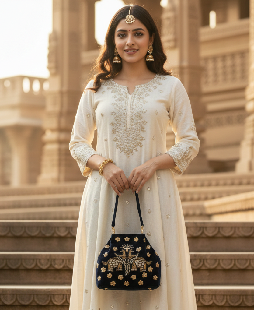 As you move through a wedding or festive gala, the majestic gold zardosi elephant serves as a powerful reflection of your own inner strength and elegance. Carrying this hand-embroidered treasure doesn't just complete your ensemble—it transforms you into a vision of heritage and high fashion, leaving you feeling radiant, sophisticated, and deeply connected to a timeless Indian tradition.