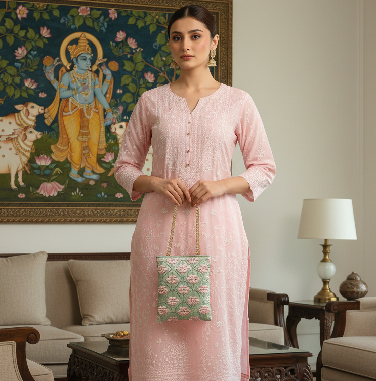 As you carry this floral treasure to an intimate gathering or pooja, the sacred lotus serves as a beautiful reminder of your spiritual connection. Carrying this handbag doesn't just complete your ensemble—it leaves you feeling centered, culturally enriched, and enveloped in a legacy of divine finesse, as if you are holding a blossoming symbol of devotion in the palm of your hand.