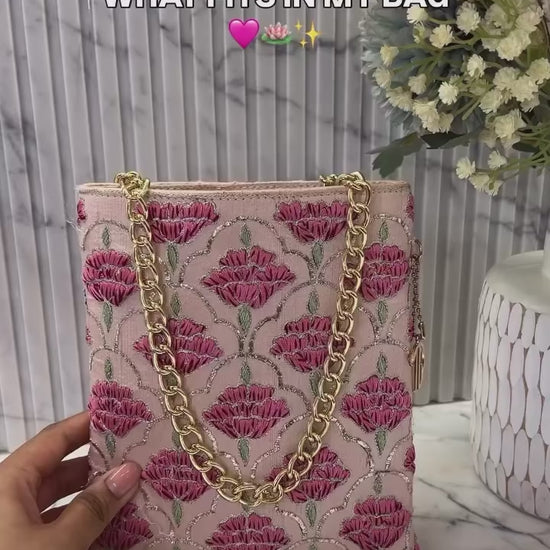 As you carry this floral treasure to an intimate gathering or pooja, the sacred lotus serves as a beautiful reminder of your spiritual connection. Carrying this handbag doesn't just complete your ensemble—it leaves you feeling centered, culturally enriched, and enveloped in a legacy of divine finesse, as if you are holding a blossoming symbol of devotion in the palm of your hand.