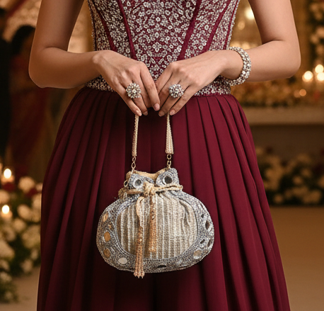 Awaken your inner icon as the rhythmic golden tassels and circular mirror accents of this potli reflect your radiant spirit with every movement. As you hold the intricately beaded top handle, the rich champagne-toned fabric and shimmering vertical beadwork provide an instant surge of "red-carpet" confidence. Its unique curved silhouette and artistic flair transform your look into a statement of modern royalty, leaving you feeling profoundly chic and effortlessly unforgettable at every wedding or gala. Carrying this bag makes you feel like the most luminous presence in any room, a true sculptural masterpiece in the palm of your hand.